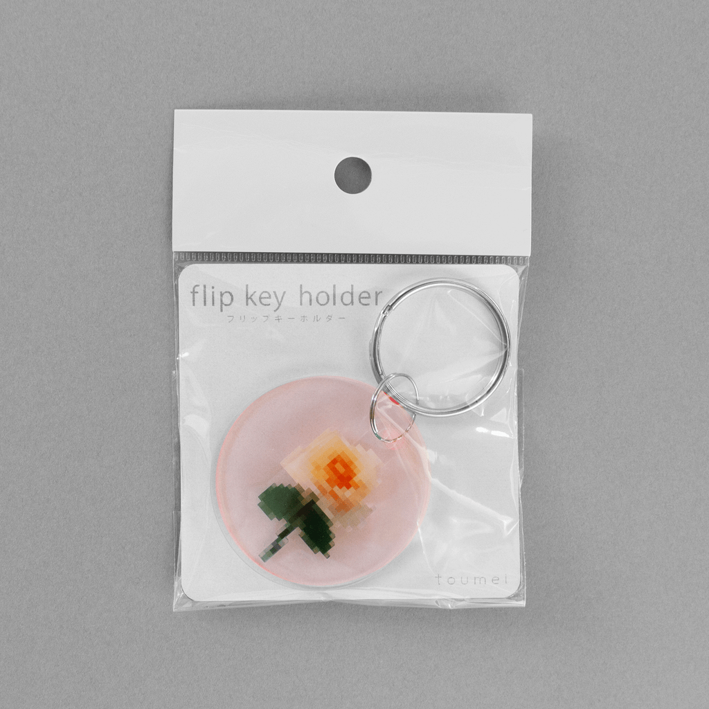 粗くピクセル化した花々を、カラフルなアクリルで挟んだリングキーホルダー。3層になっていて、手に持つたび揺れる姿は、見ているだけで楽しい気分に。鍵にはもちろん、バッグのワンポイントにもぴったりの可愛さです。