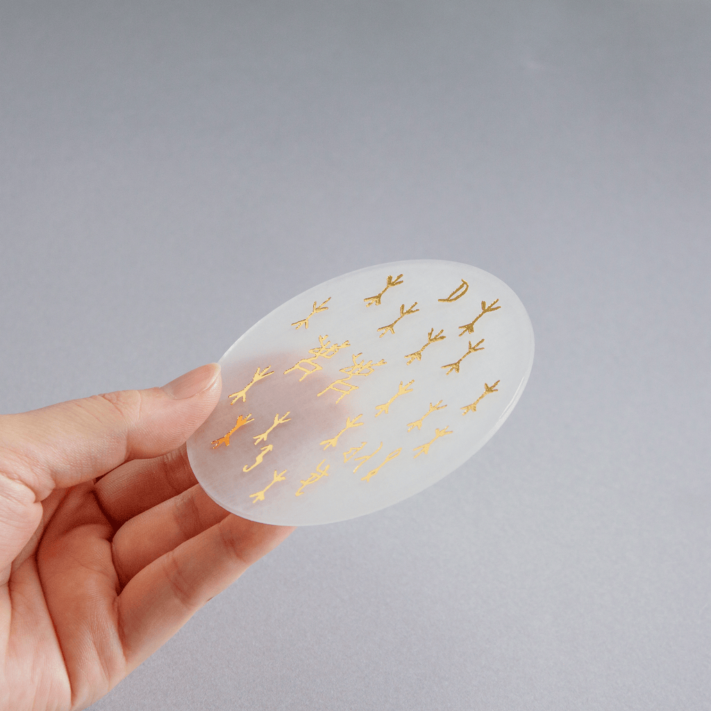 最古の漢字祖形と⾔われる古代⽂字「甲⾻⽂字」で表現された、⾃然の中で⽣きる⼈の営み。⾒つめるほどに、原始の情景が浮かびます。