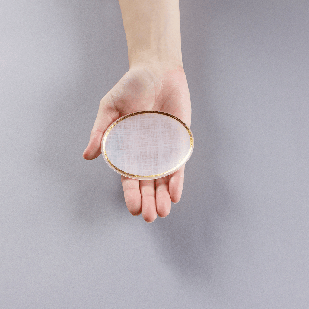 高濃度アルコール、塩素系漂白剤はひび割れや箔の変色が発生する場合がございます。清掃および消毒には中性洗剤を薄めたもの、次亜塩素酸水の希釈液で行う事をお勧めいたします。洗っていただく際は柔らかいスポンジ等で優しく洗ってください。