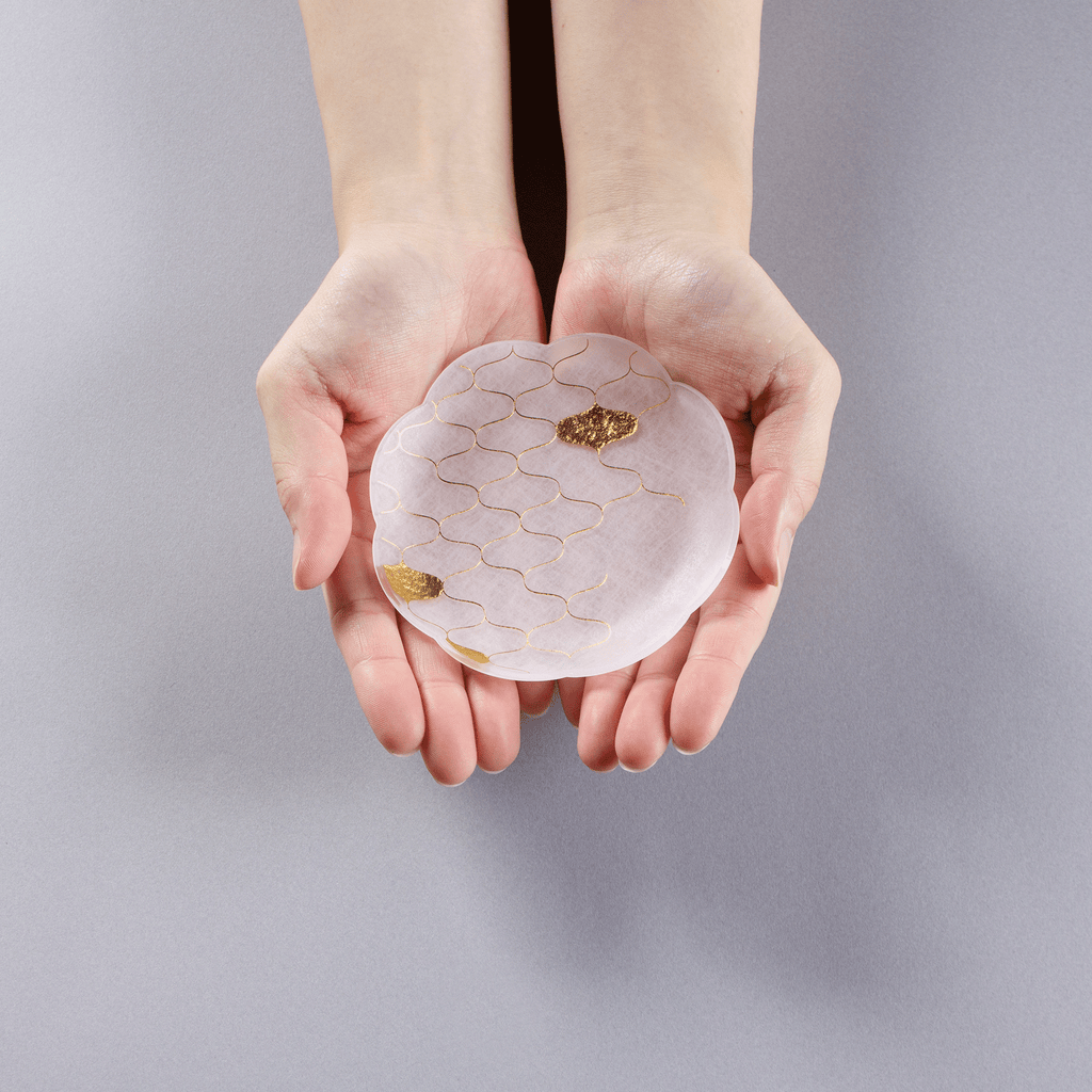高濃度アルコール、塩素系漂白剤はひび割れや箔の変色が発生する場合がございます。清掃および消毒には中性洗剤を薄めたもの、次亜塩素酸水の希釈液で行う事をお勧めいたします。洗っていただく際は柔らかいスポンジ等で優しく洗ってください。