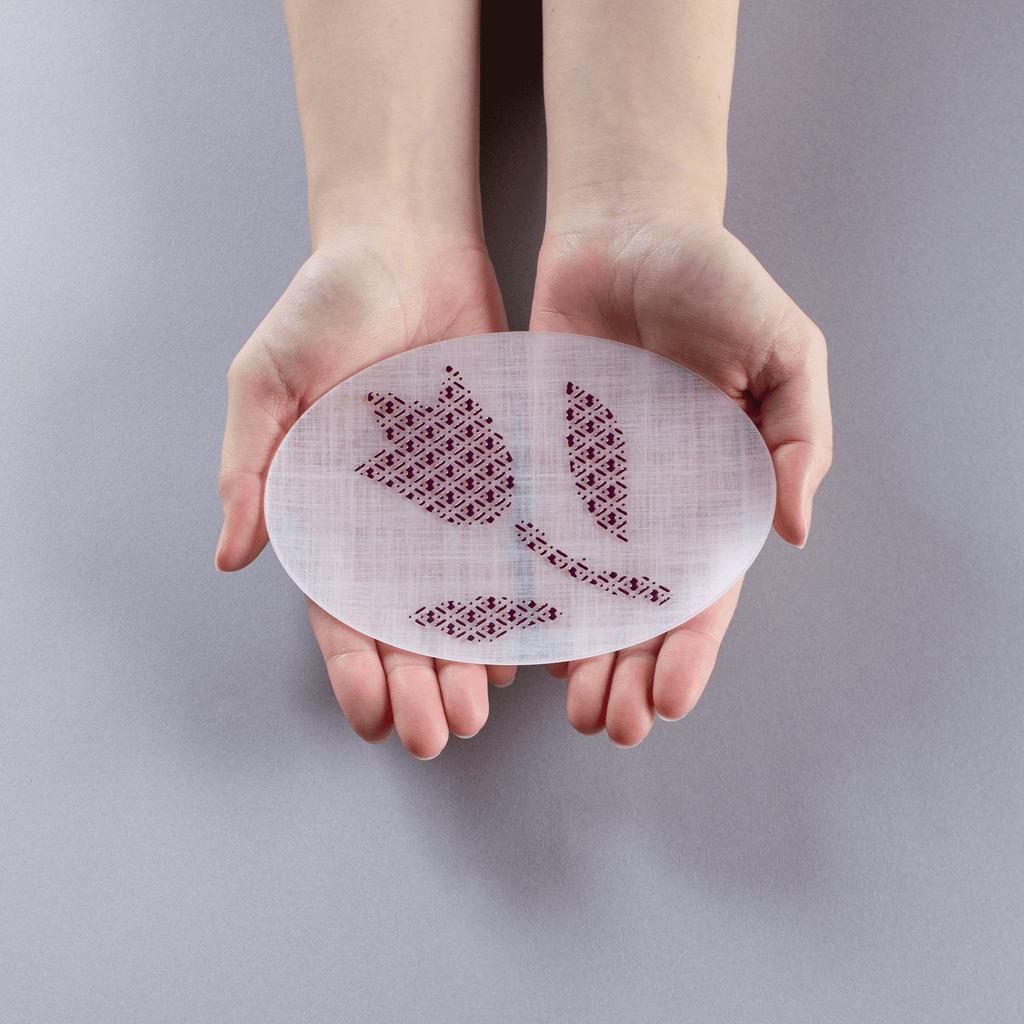 透明感のあるアクリルに、天然漆で描かれた京印伝の模様が美しく調和したまめざら。