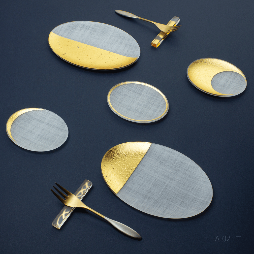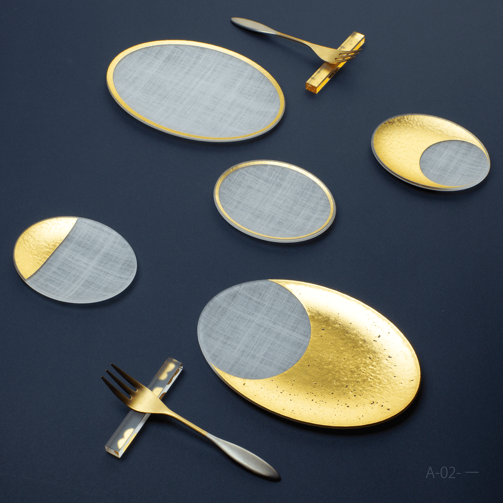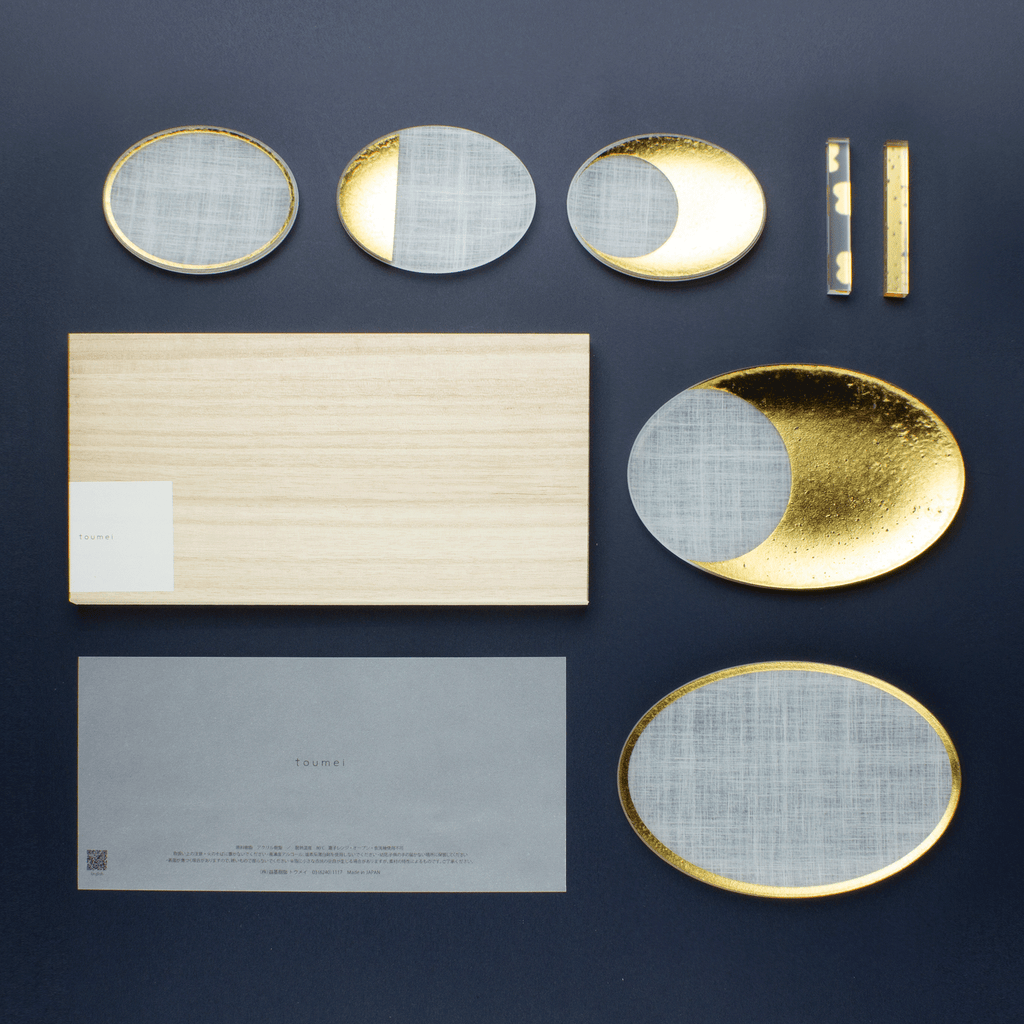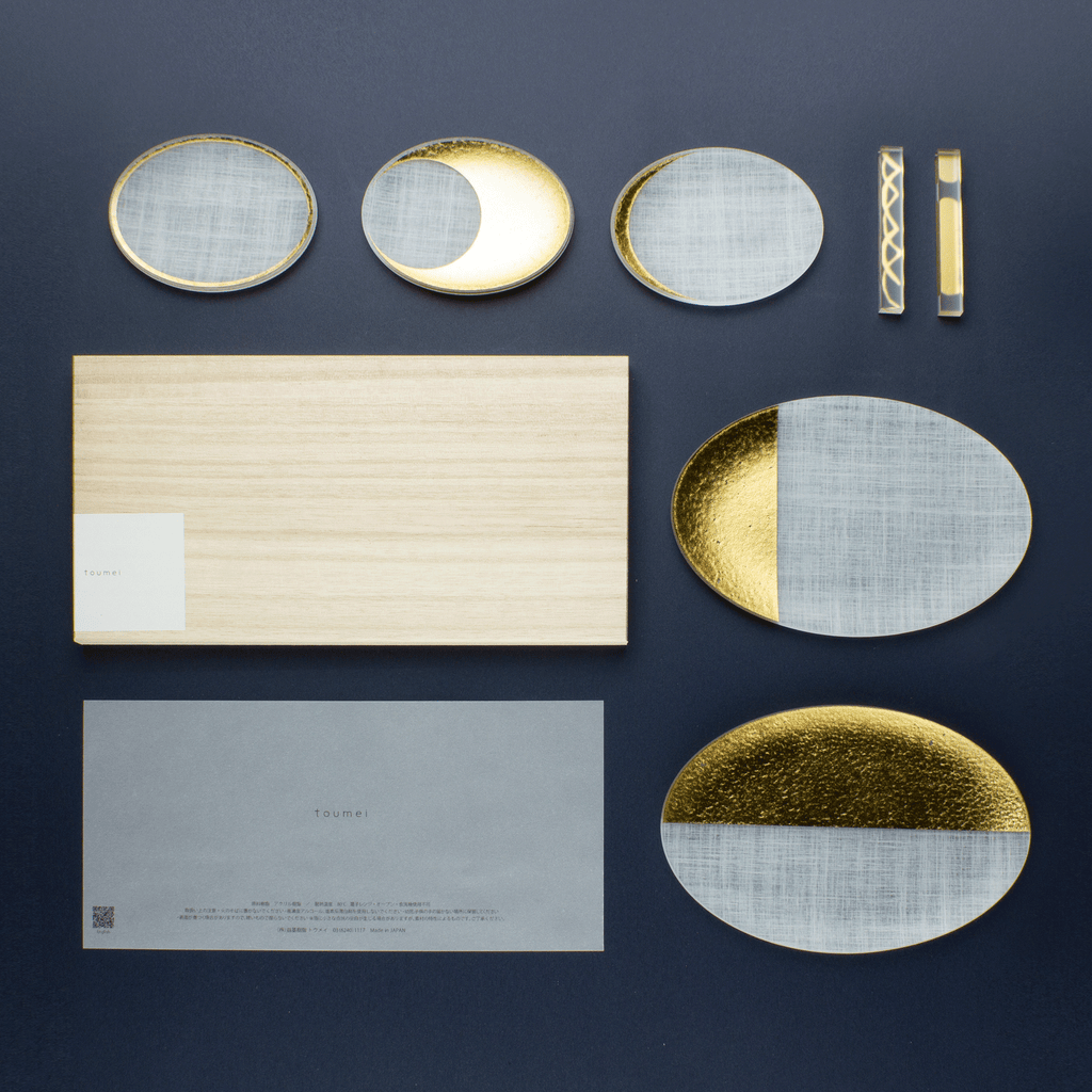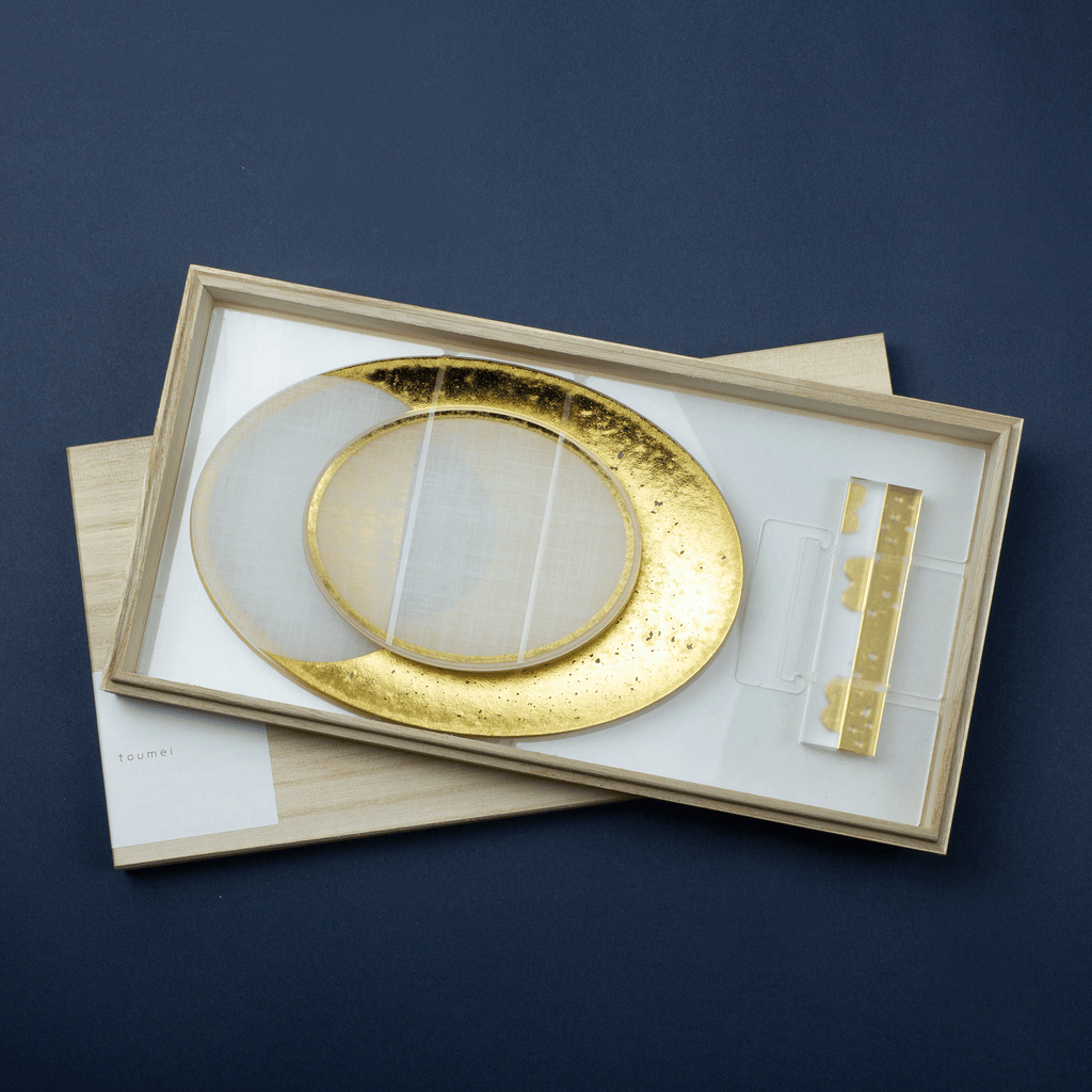 セットの主役は、マットな和紙調アクリルに金色の箔押しで月齢を描いたお皿「箔coval」。15.5cmと9cmのサイズ違いの組み合わせに、同じく箔をあしらった細身のカトラリーレスト「箔 cutlery rest hoso」を加えた、3種7点のギフトセットです。
